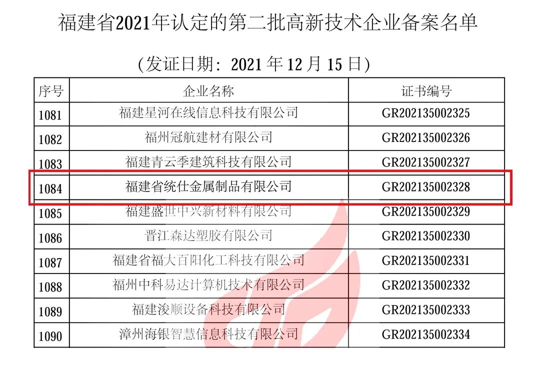 根據(jù)科技部、財政部、國家稅務(wù)總局《高新技術(shù)企業(yè)認定管理辦法》公示了《福建省2021年認定的第二批高新技術(shù)企業(yè)備案名單》,福建省統(tǒng)仕金屬制品有限公司成功入選,公司從此正式邁入國家高新技術(shù)企業(yè)行列。