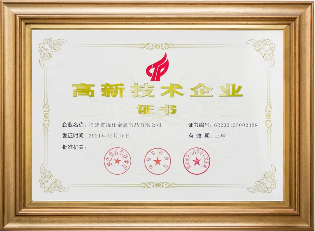 福建省統(tǒng)仕金屬制品有限公司通過國家高新技術(shù)企業(yè)認定