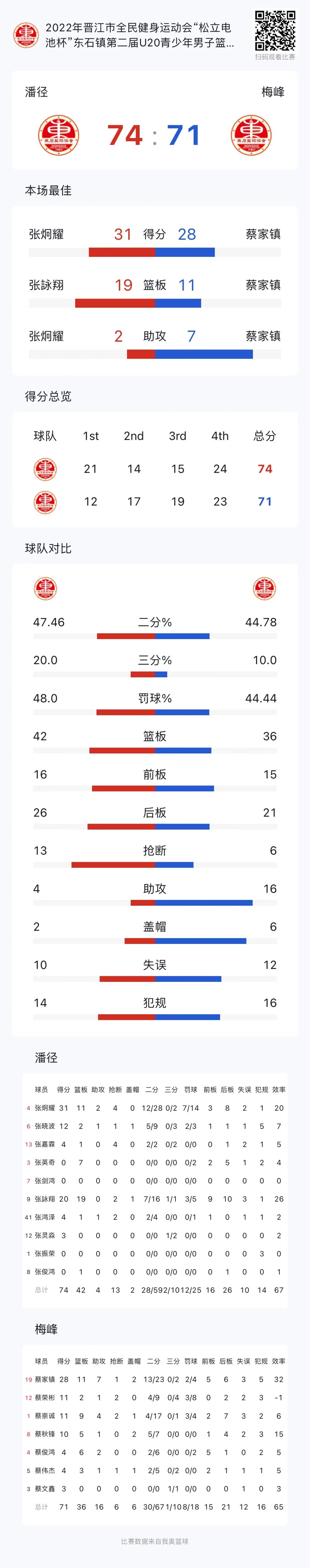 末節(jié)比賽,潘徑陷入得分荒,梅峰連續(xù)反擊反超5分,再次打出潘徑暫停,暫?;貋?lái)張炯耀連續(xù)殺入內(nèi)線造成殺傷緊咬比分,蔡榮彬搶斷反擊打進(jìn),拉開到5分。張?jiān)佅鑿?qiáng)殺籃下追到3分。蔡家鎮(zhèn)突破后拋射兩分打進(jìn)給予回應(yīng),最后時(shí)刻,張?jiān)佅枳飞砣置泻笄皥?chǎng)完成搶斷,籃下打進(jìn)實(shí)現(xiàn)反超,打停梅峰,暫停回來(lái),張鴻澤完成關(guān)鍵搶斷后反擊2+1打進(jìn),加罰沒(méi)能命中,但張?jiān)佅枘玫交@板球,比賽就此結(jié)束,全場(chǎng)比分74:71。潘徑拒絕逆轉(zhuǎn)?。?!險(xiǎn)勝梅峰奪冠!!