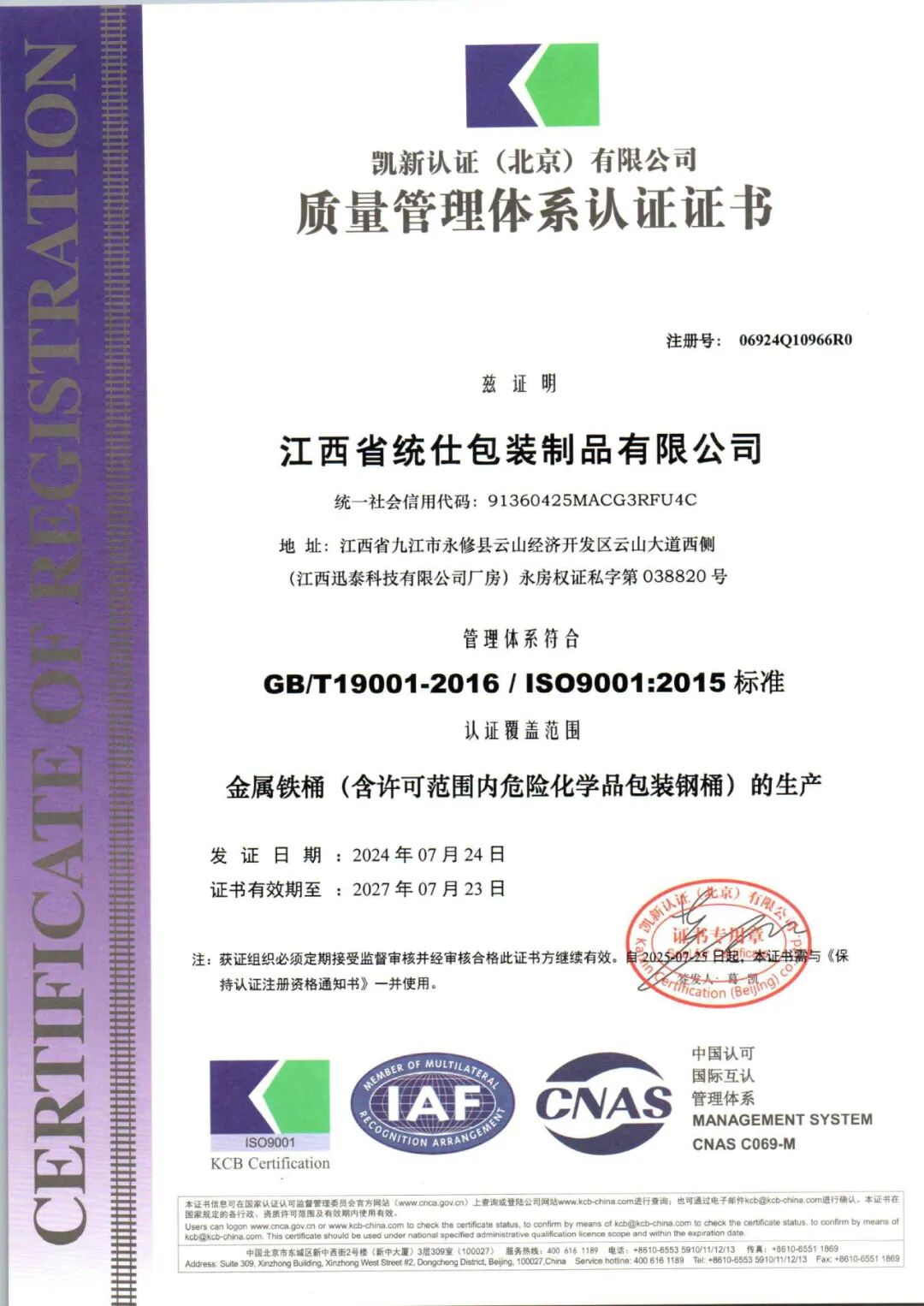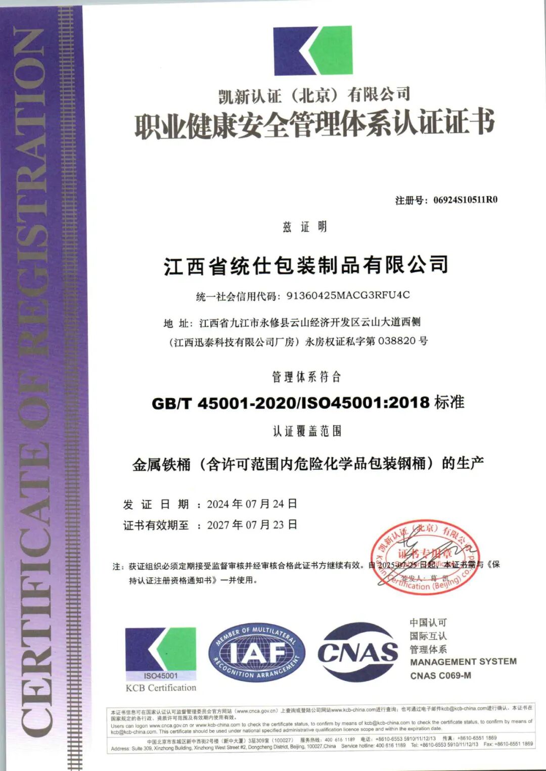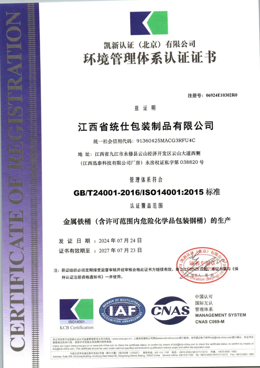 7月底,江西省統(tǒng)仕包裝制品有限公司順利通過了ISO三體系認(rèn)證: